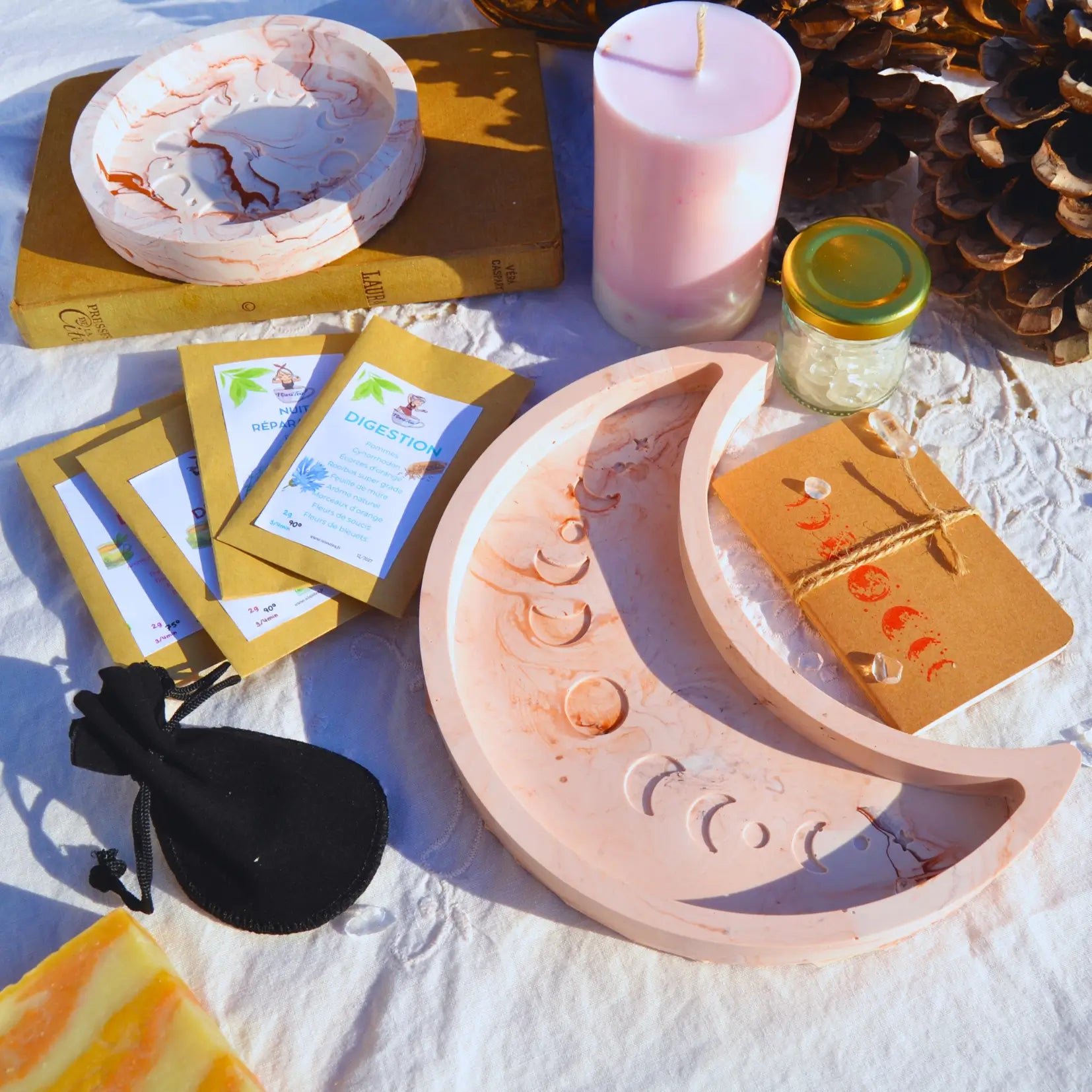 Le sens des choses : Rituels lunaires, bougies d'intention et artisanat éthique. Créations en Jesmonite et soins naturels fabriqués à la main en Charente-Maritime.